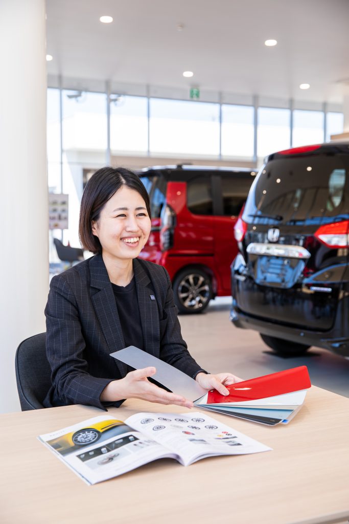 いくつか面接を受けた中でも、ホンダカーズ名東は社長が直々に「今まで女性の営業はいなかったけど、賭けようと思います。」と言ってくれたことが心に響いて入社を決めました。働いていく中で女性の営業ならでは強みも見つけていくことができました。男性営業との大きな違いは接客にあると思います。女性の方が雰囲気が柔らかく話しやすいと言ってくださるお客様もいますし、女性ならではの視点での提案もすることができます。今後女性の営業がもっと増えてくれると会社にとってもお客様にとっても良いのかなと思います。
