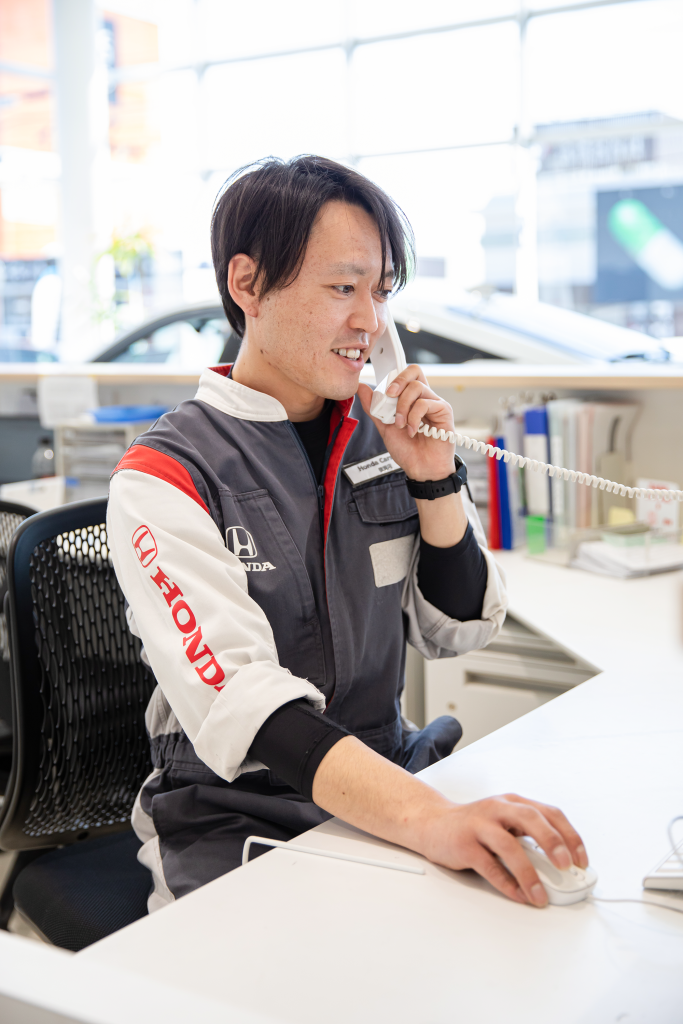 専門学校の説明会に来ていたホンダカーズ名東に興味を持ちました。特に車にこだわりがあったわけではありませんが、車の中ではシェアが高い国産車が好きなことと、お客さまと接する仕事がしたいと思っていたため、ホンダカーズ名東で働くことを決めました。働きはじめてからガソリンスタンドでの経験・知識は役に立っており、よかったと思いました。今はフロント業務をはじめ、点検・車検・一般整備なども行なっております。車を修理した際などに「ありがとう」とお客さまからお言葉をいただいた時は、充実感や満足感があります。