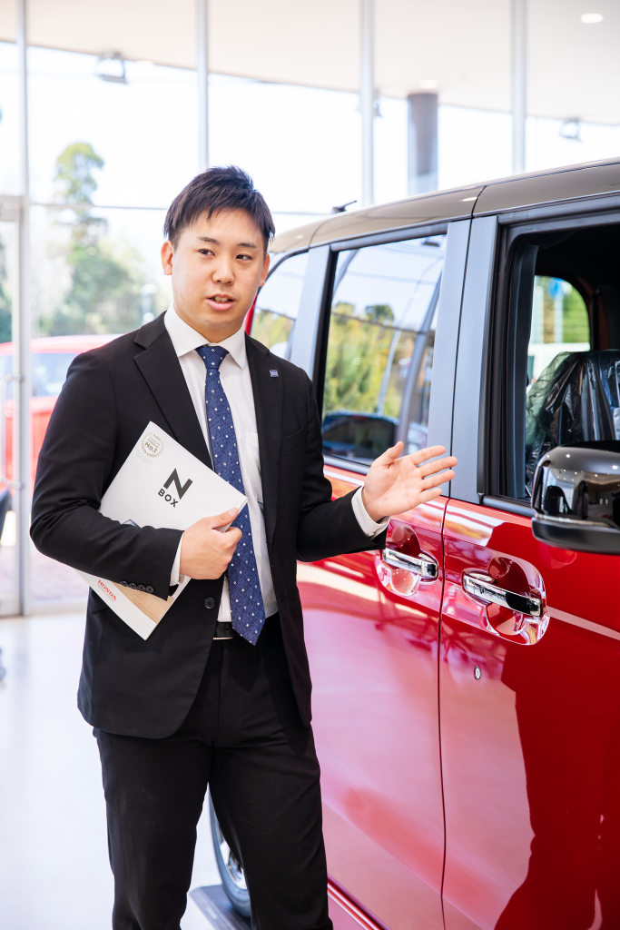先輩や会社の手厚いサポートで、早く現場で活躍できます私は人と関わる仕事がしたい、その中でもお客様と長い期間関われる車の営業をしたいと思っていました。大学の合同説明会で何社か話を聞いた中で、ホンダカーズ名東の経営理念に共感して応募を決めました。当時は3店舗募集をしていましたが、第一志望としていた日進南で働くことができたので良かったです。